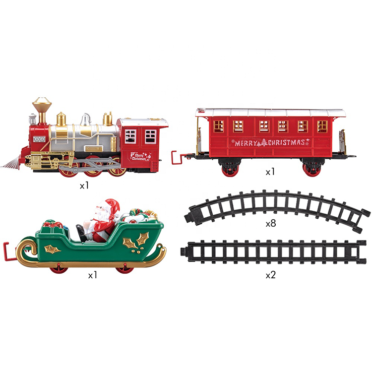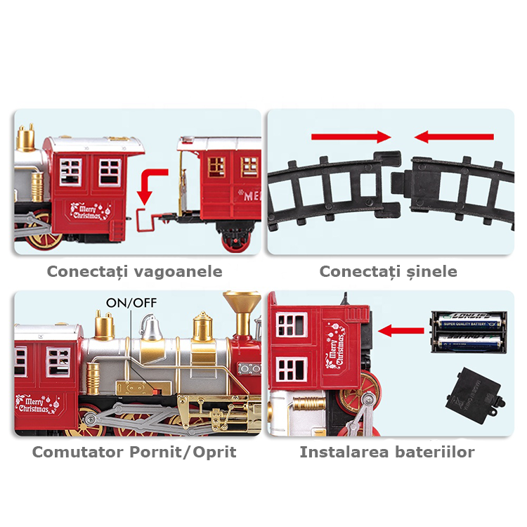 • Include 13 piese: locomotivă cu lumini, vagon, sanie cu Moș Crăciun, șine de montaj